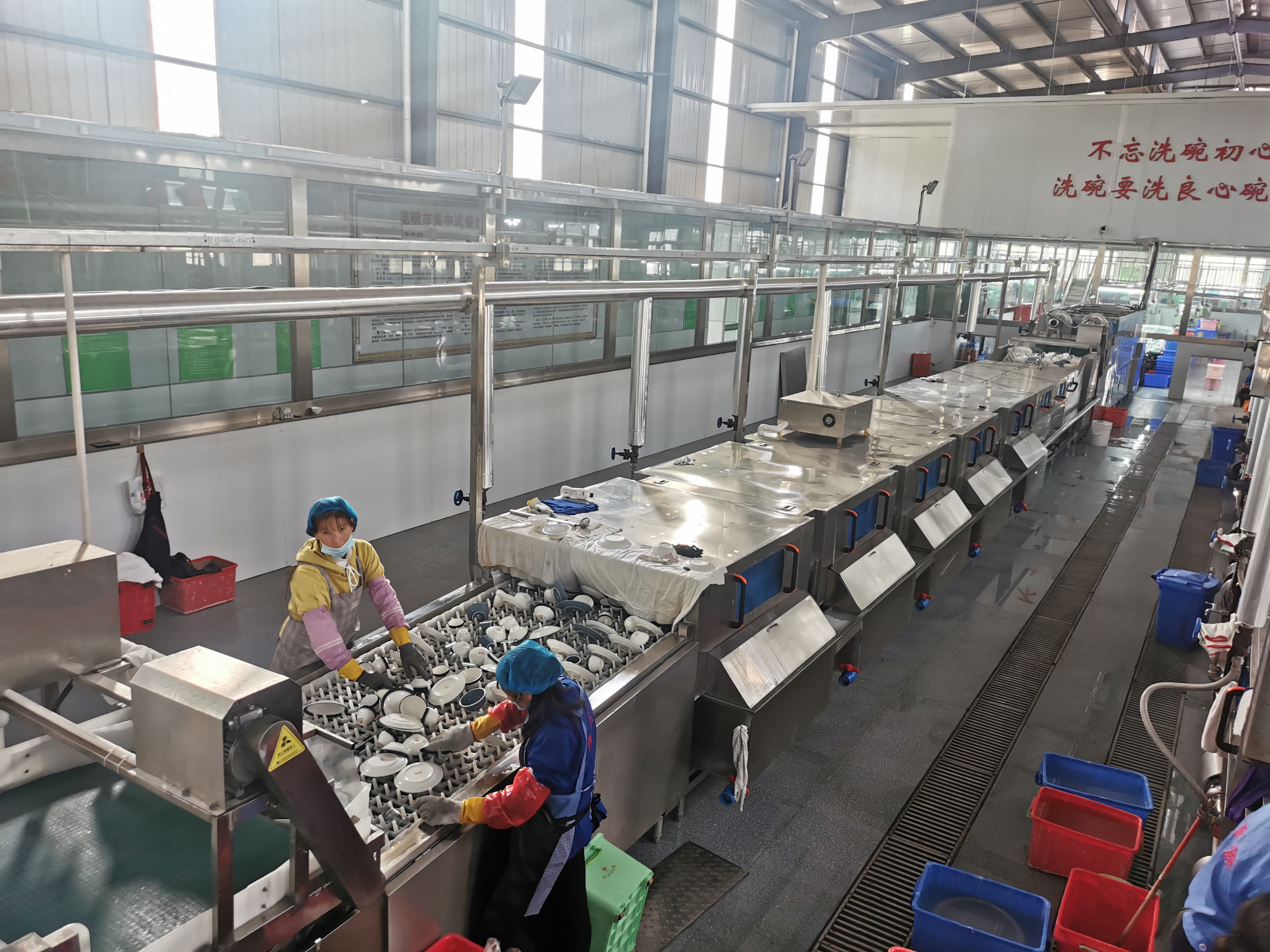 **步:餐盘收集与预处理。食堂工作人员在收餐区对学生餐盘进行初步分拣,将剩余食物残渣倒入专用泔水桶,避免残渣堵塞洗碗机管道。随后将餐盘按规格整齐摆放在流水线进料传送带上,确保餐盘开口朝上、摆放间距均匀,防止叠放导致清洗不彻底。部分设备配备预冲喷淋装置,会对餐盘进行初步冲洗,去除表面松散残渣,为后续清洗减轻负荷。